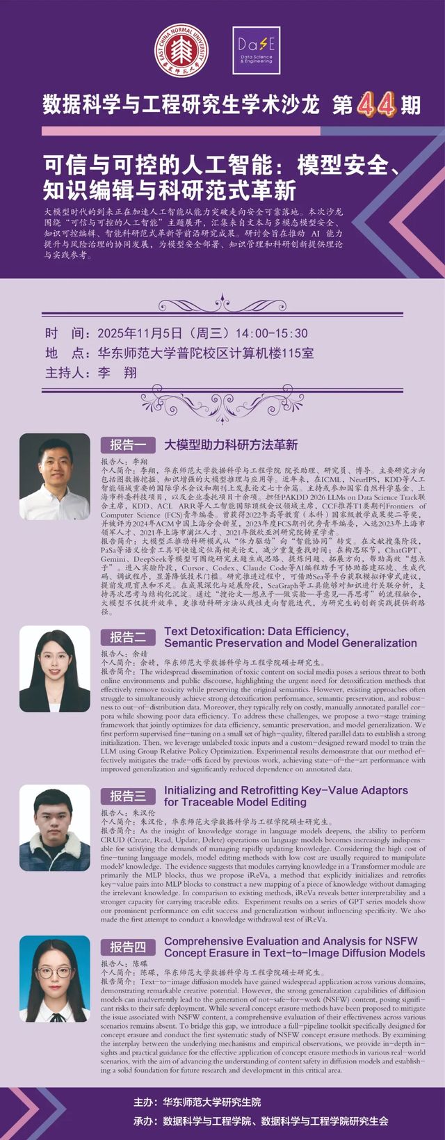 11月5日研究生学术沙龙(第44期) | 可信与可控的人工智能:模型安全、知识编辑与科研范式革新