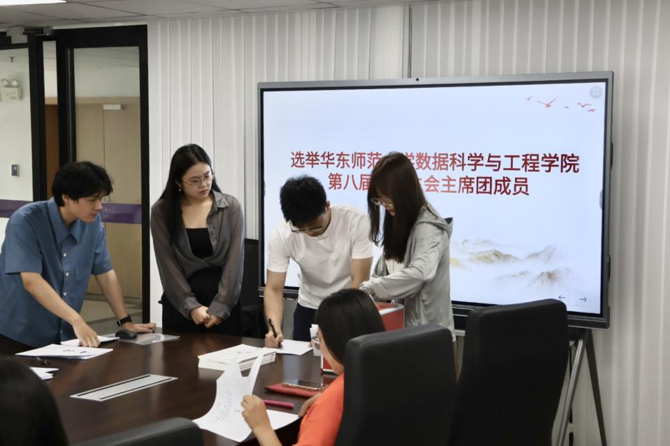华东师范大学数据科学与工程学院第八次研究生代表大会于2025年9月15日在普陀校区理科大楼AH02会议室顺利召开。本次大会旨在总结过去一年研究生会工作,选举产生新一届主席团成员和各部门负责人,并展望未来发展方向。学院团委书记杜明月老师出席本次大会。大会由第七届研究生会主席团成员黄鑫雅同学主持。