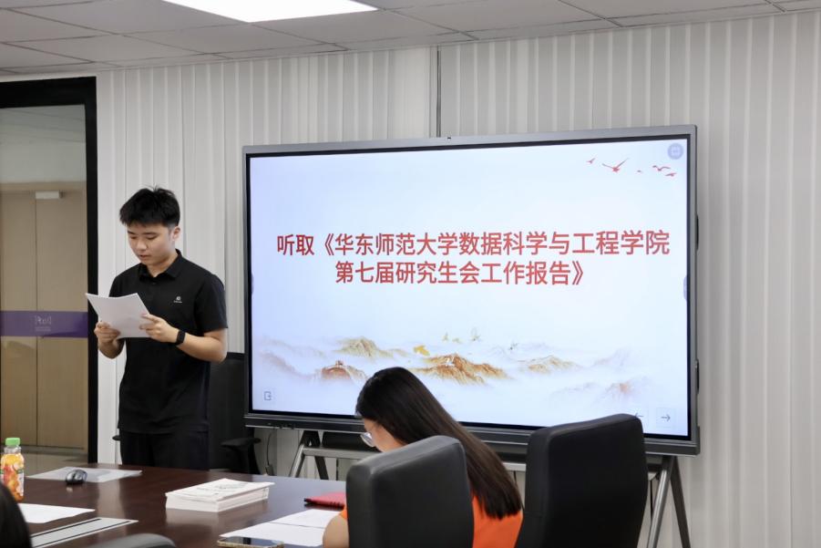 首先,全体代表审议并通过了《华东师范大学数据科学与工程学院第八次研究生代表大会会议议程》。随后,第七届研究生会主席张嘉睿同学代表上一届主席团作了题为《砥砺奋进,数创未来》的工作报告。报告回顾了第七届研究生会在学术交流、校园文化、人文关怀等方面取得的成绩,并提出了构建学术领航、就业赋能、强身润心、创意创新的研究生会未来工作方向。